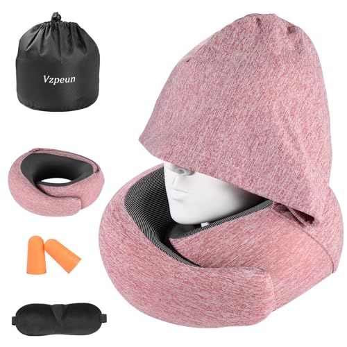 Vzpeun Travel Pillow - Hooded Neck Pillow Airplane Memory Foam Filling for Plane, Office, Cars Sleeping, Road Trip, Long Flights, Portable Plane Accessories, Includes Eye Mask & Earplugs (Red)